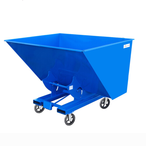 When materials are loaded into the hopper they can easily be transported thanks to the fork pockets attached to the hopper or the casters attached to the fork pockets. Once the hopper is ready to be emptied the operator can press the releasing a latch mechanism. The latch is spring loaded and secures the hopper in the upright position for filling. After the hopper is loaded, the load can be dumped from the seat of a forklift. Also know as “bump and dump”, the bumper release is activated when the bumper pad hits or bumps into the receiving container, releasing the latch and triggering the dumping action. The forklift operator can also use the manual release cable to tip the hopper.